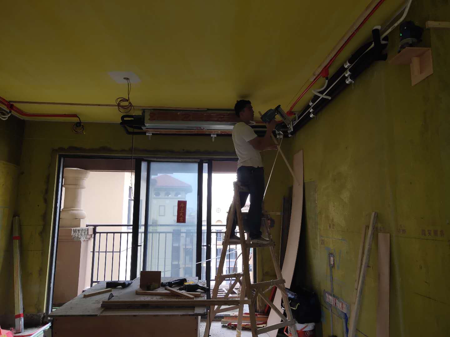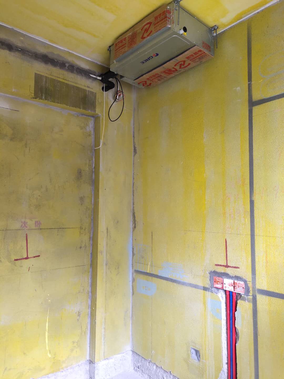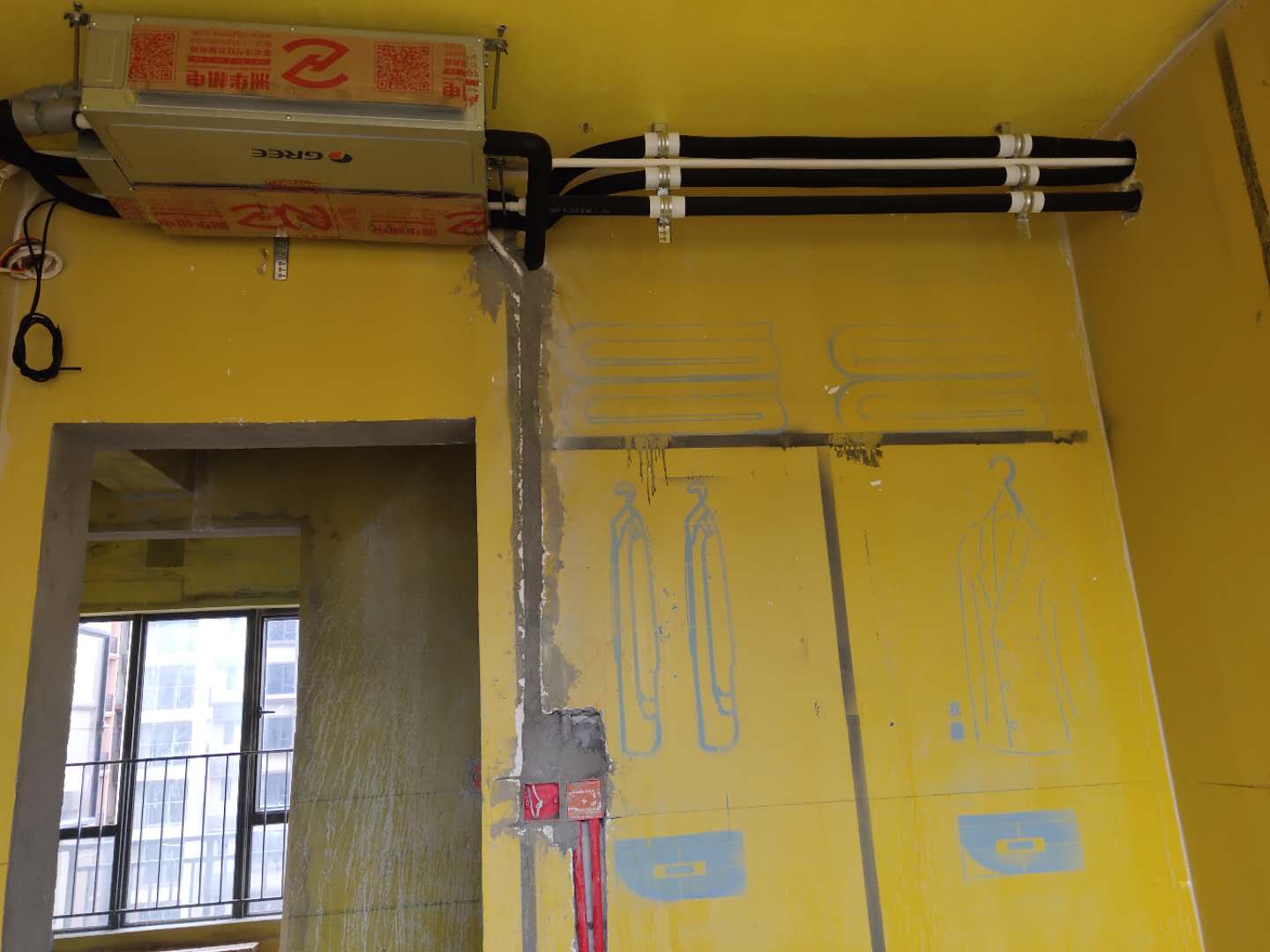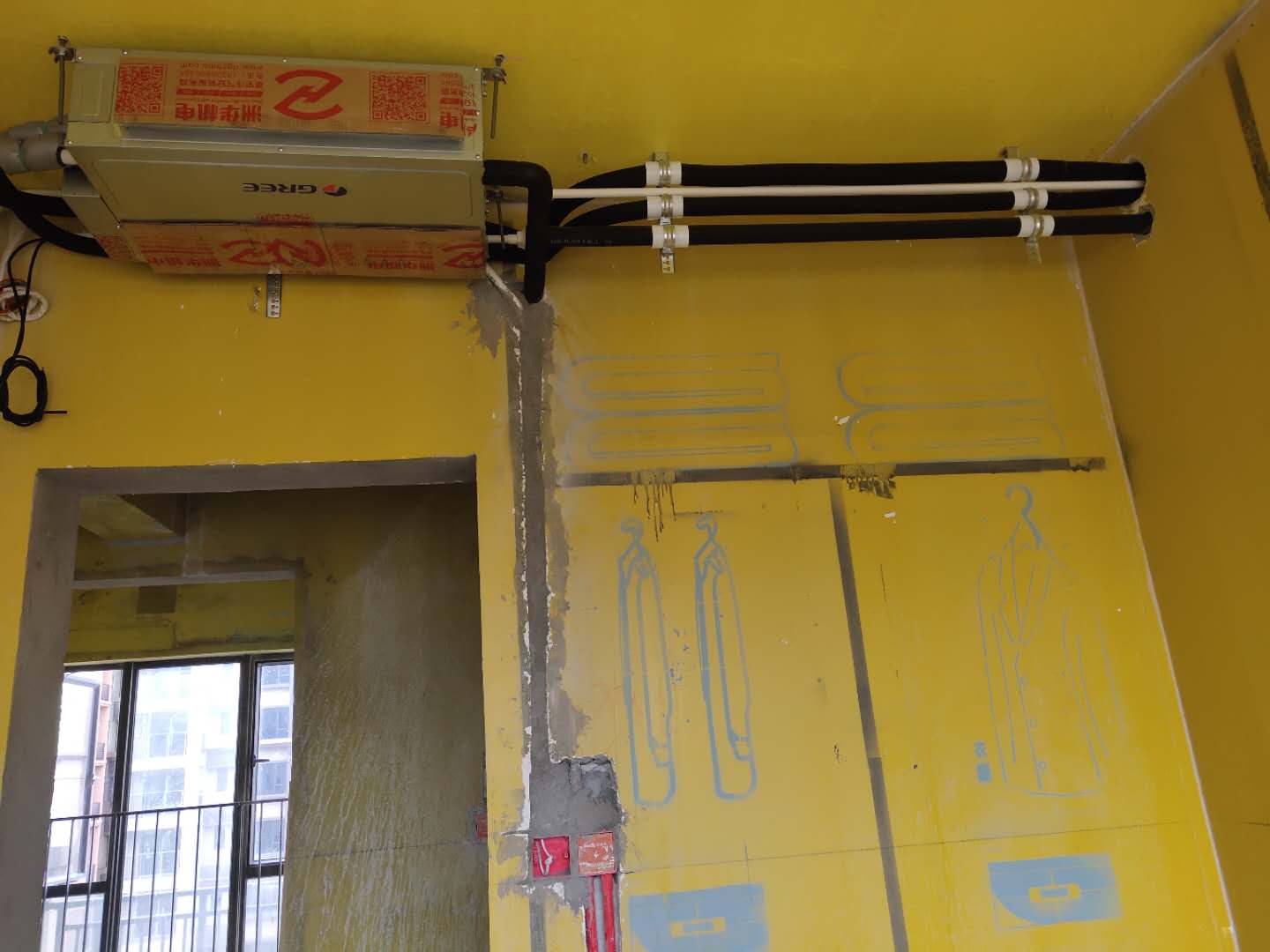 格力空調(diào)客廳設(shè)備安裝,空調(diào)設(shè)備已經(jīng)安裝好,正在裝修中